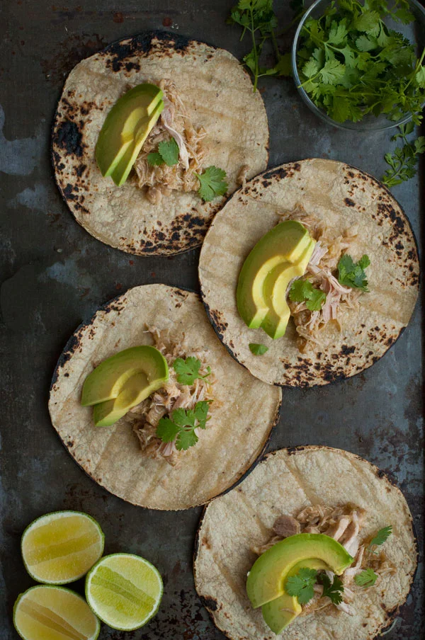 Assemble the chicken tacos by adding chicken to tortillas then topping with avocado, cilantro and a squeeze of fresh lime juice.