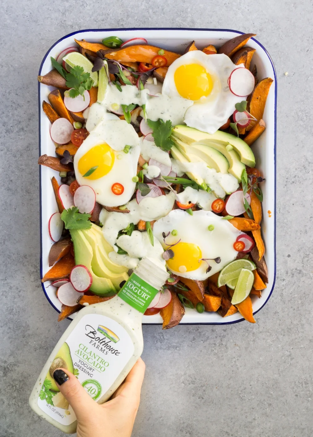 Who can resist any dish with the word nacho in it, right? I swapped out the corn tortilla chips for sweet potato wedges and topped the sweet potatoes with avocado, radish, sprouts and black beans to make these nachos a little healthier. I also threw on some some fried eggs, because a perfectly runny egg yolk will convince even the pickiest of eaters that this dish is worth eating. I added a little cheese to keep them similar enough to real nachos, but the real key to this recipe was adding a ton of flavor by drizzling the Bolthouse Cilantro Avocado Yogurt dressing on top. Just because the bottle says salad dressing, doesn’t mean you only have to use it on salad. This cilantro yogurt situation is the perfect creamy addition that creates a super flavorful and much healthier version of nachos that you can feel good about eating.