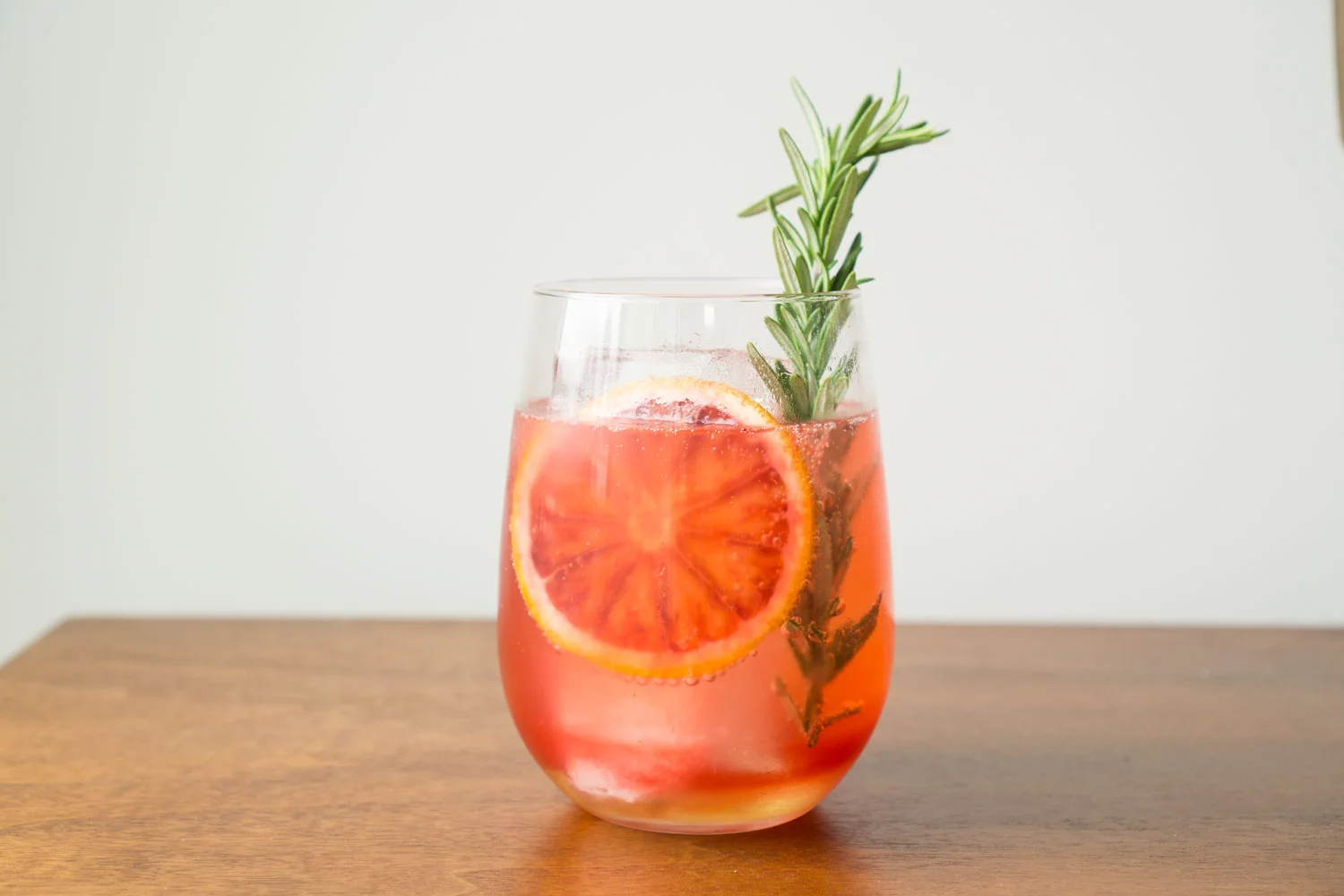In a glass filled with ice add the gin, elderflower liquor and blood orange juice. Top the drink off with tonic water, as much as you want and garnish with rosemary.