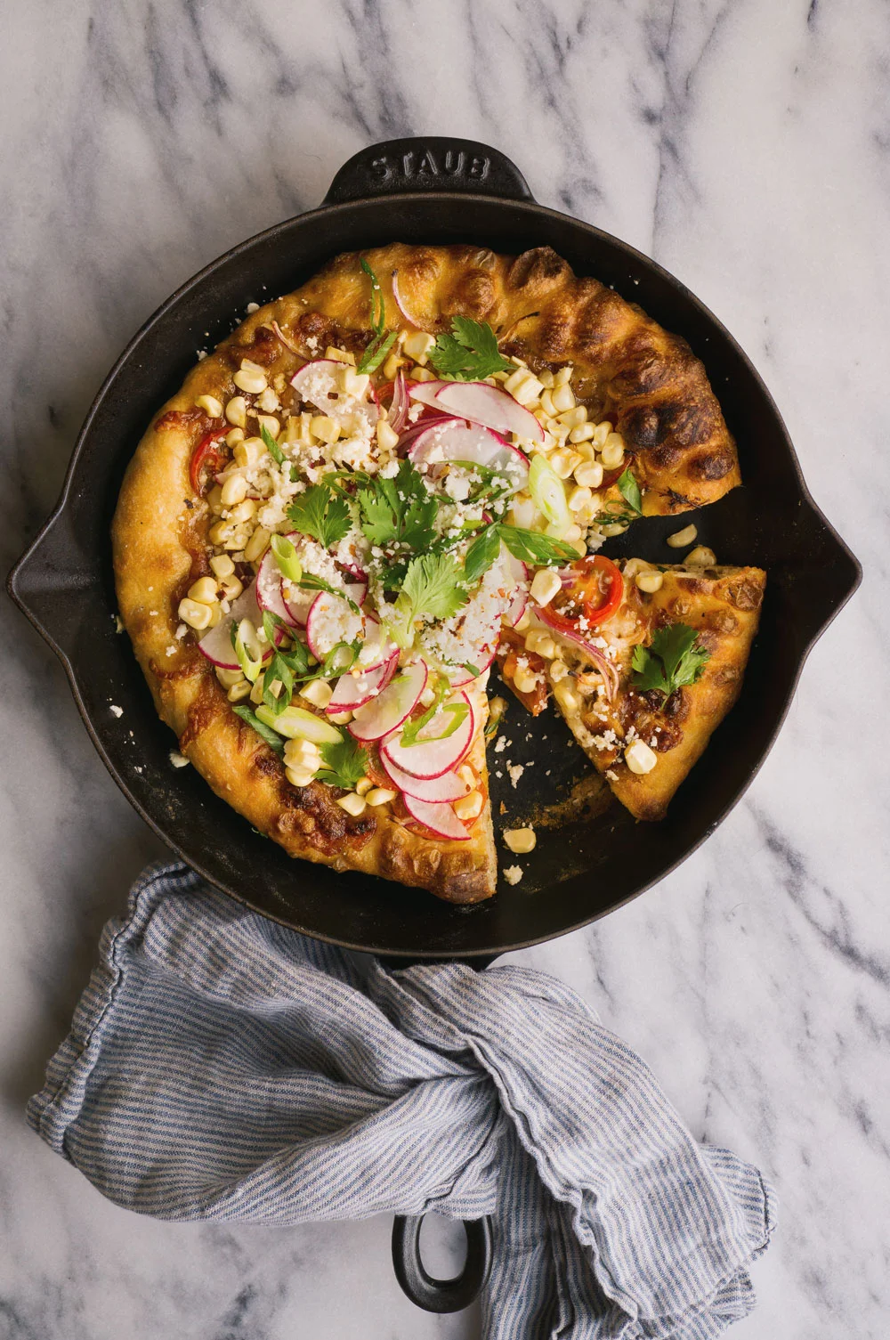 Place the skillet in the oven and cook until the crust is golden brown, about 10 - 12 minutes. Carefully remove and tip with corn, radish, cilantro, scallions, queso fresco and red pepper flakes.