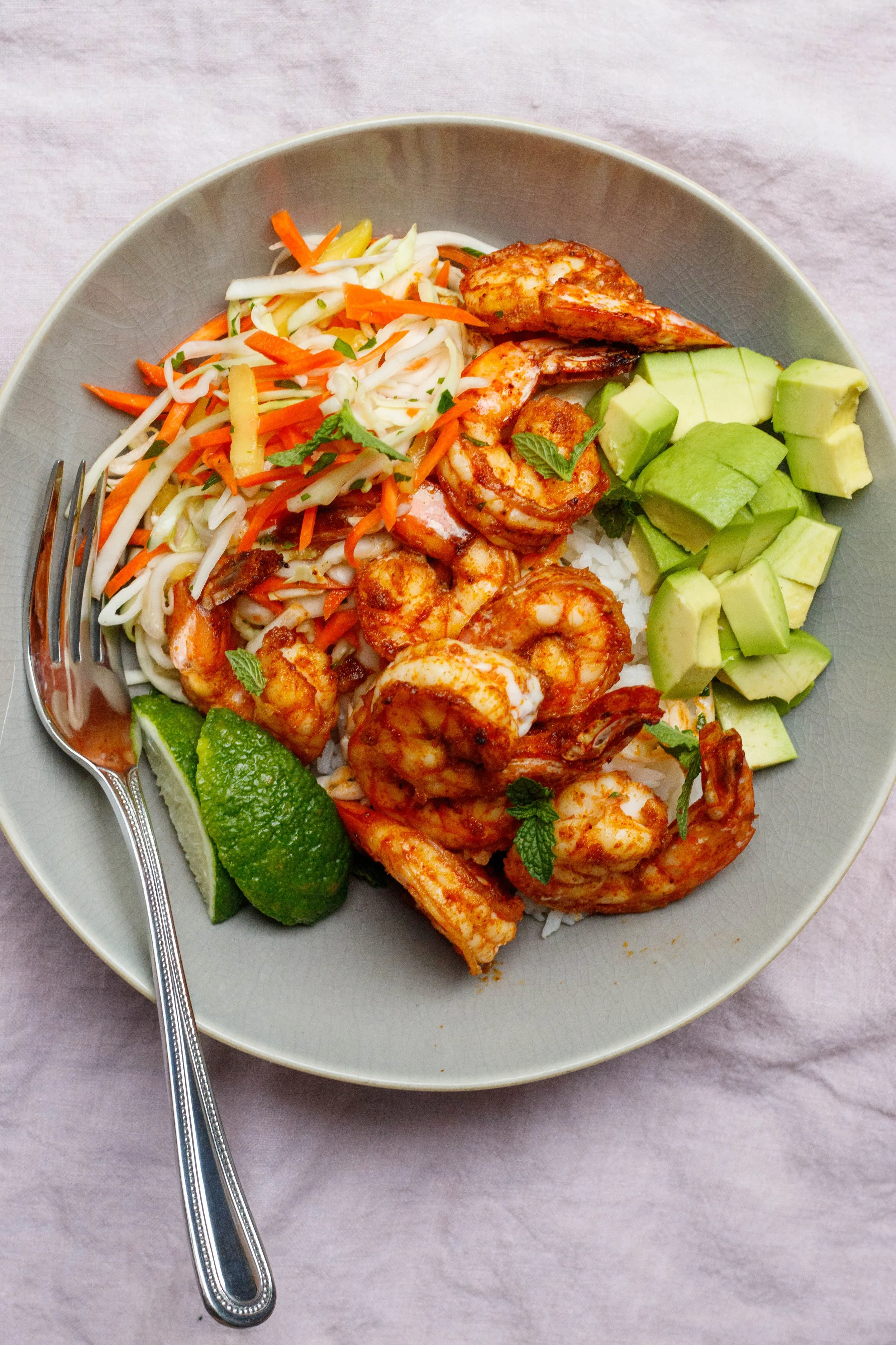 When ready to eat serve the shrimp with a heaping spoonful of the rice and cabbage slaw and garnish with avocado, lime wedges, and fresh soft herbs.